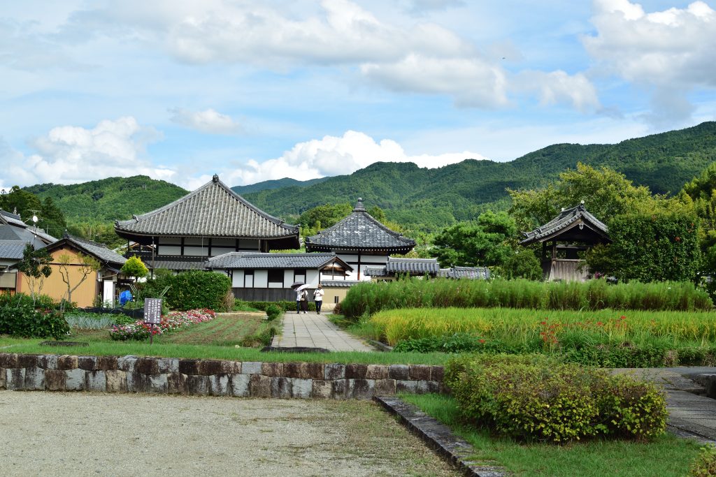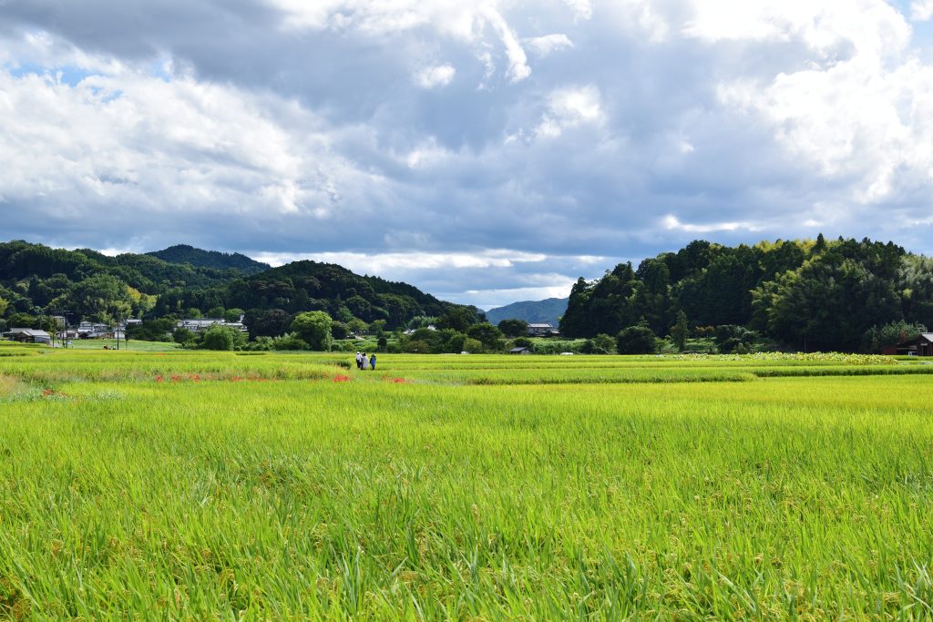 飛鳥の中心地、飛鳥寺付近から南方を。来月の半ばにはどこもかしこも稲刈りのはずなので、この風景は今だけ。本当ならこの時期は彼岸花のシーズンなのであぜ道はもっと真っ赤なんですが、今年は(と言うか今年”も”)残暑のせいでまだまばら。
