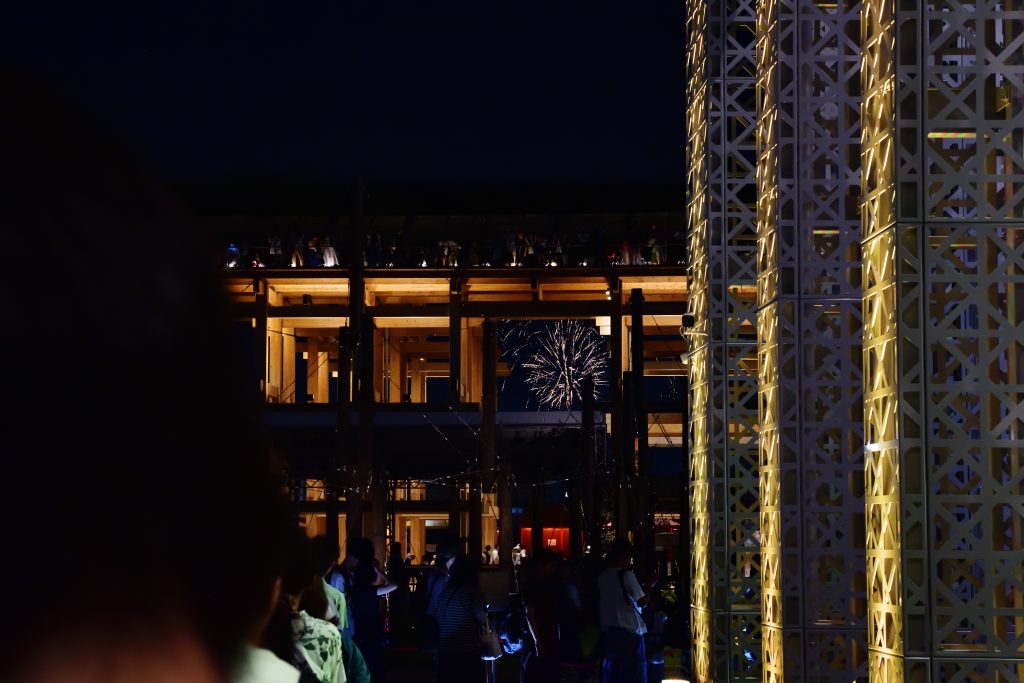 待っている間に、大屋根リングの向こうから花火が。