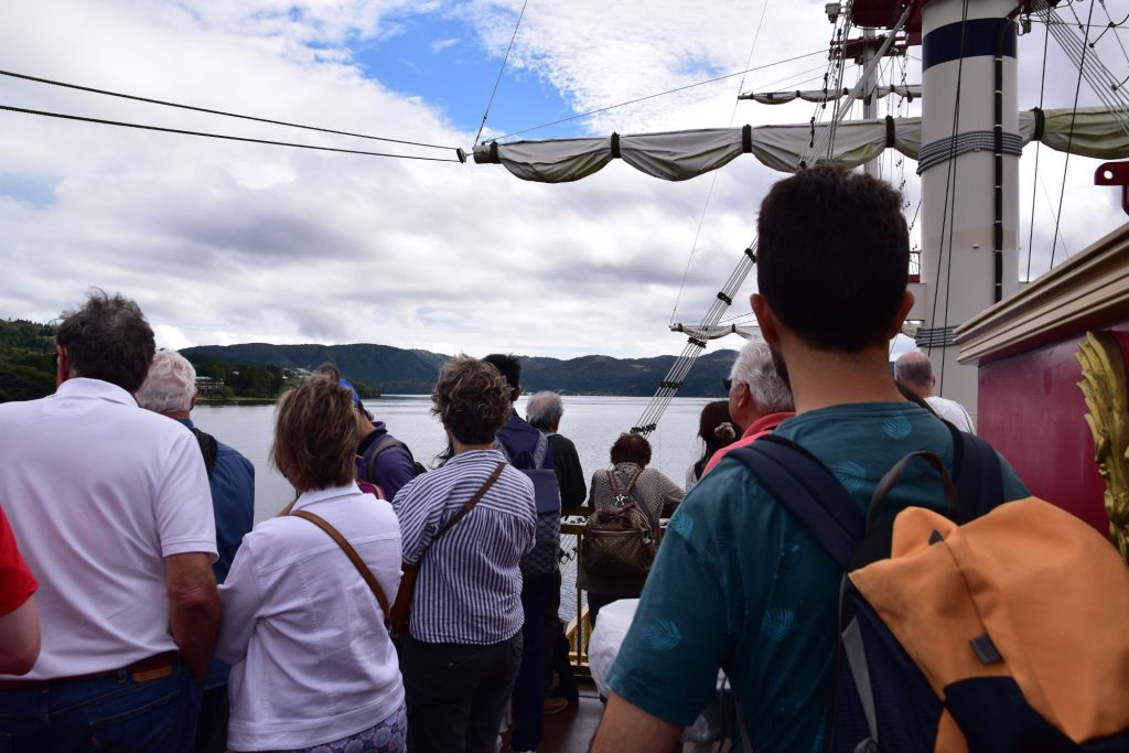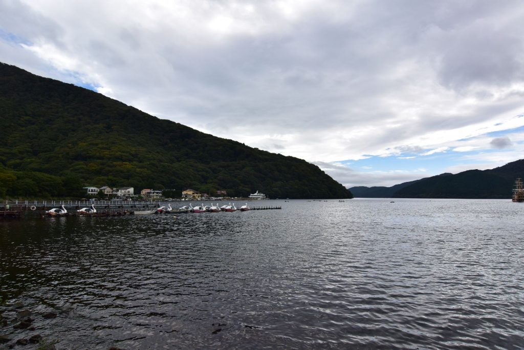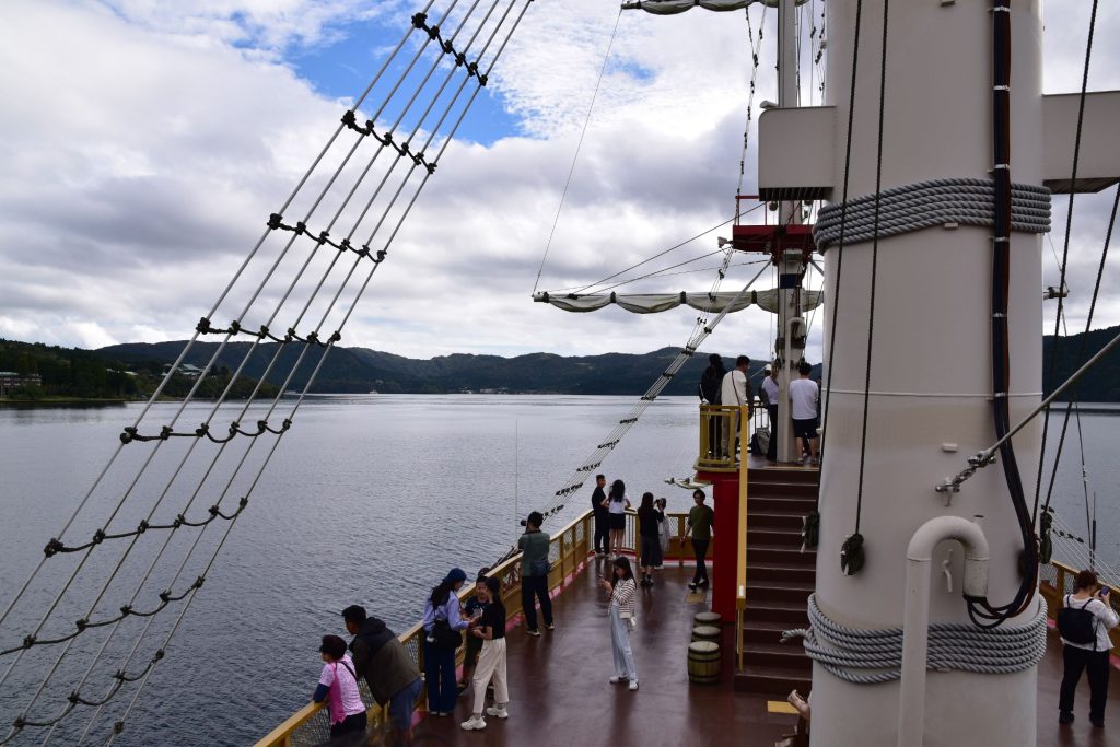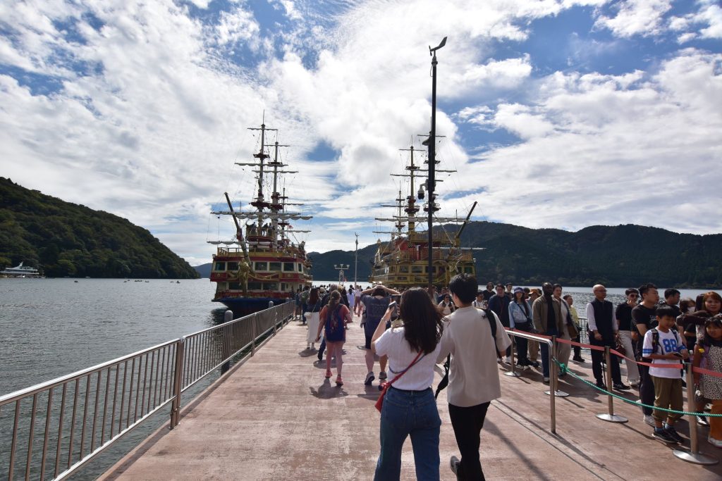 芦ノ湖 2025.10.05 大涌谷からさらに西へ。 芦ノ湖へ。ここからは湖を縦断します。 箱根海賊船。そう言えば、何で海賊船?よく分かりませんがー 人いっぱいで甲板は海賊船ってか移民船ww 対岸が見えてきました。