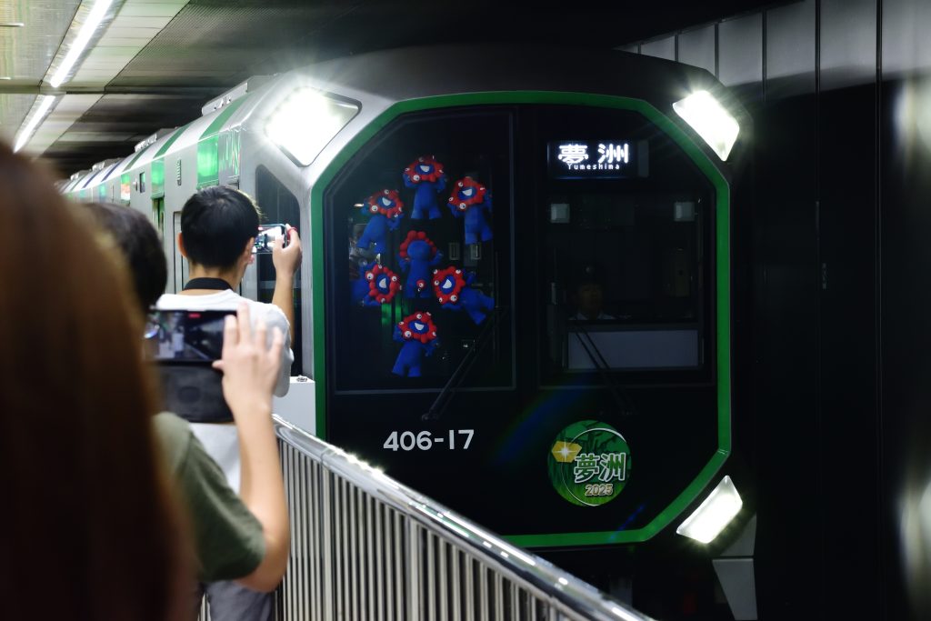 地下鉄乗り込んでら、ミャクミャクが運転席にへばり付いてました。これも1運用だけの限定らしいでです。メトロの社員さんの発案なんでしょうか。こういうのは大阪のノリなんですかねー。そんな悪ノリが積みかさなかったものが、今回の万博のアクセントになってたように思います。