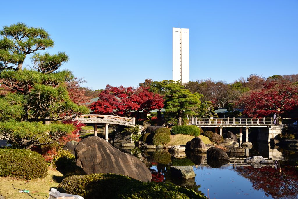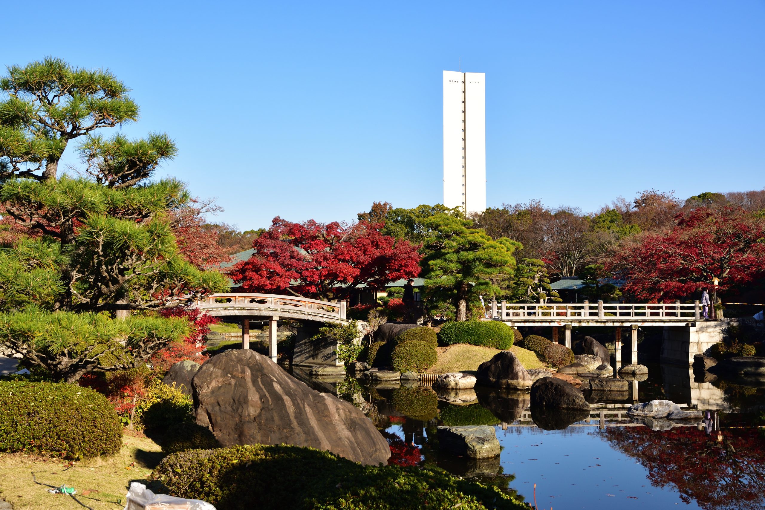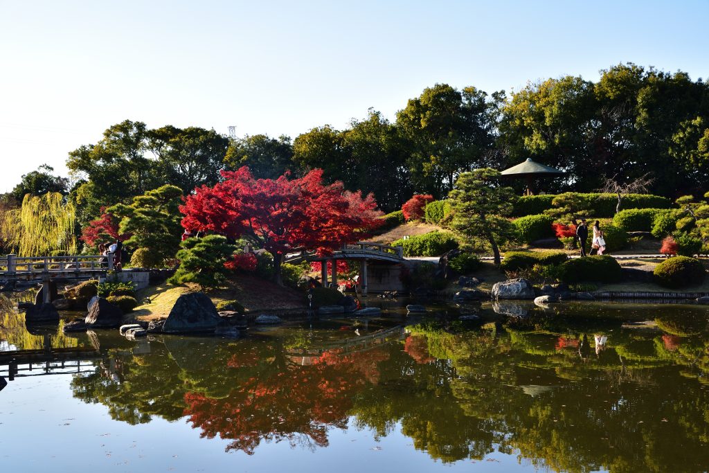 日本庭園はモミジが見頃。水が濁ってるのが残念ですが、リフレクションもシッカリ。