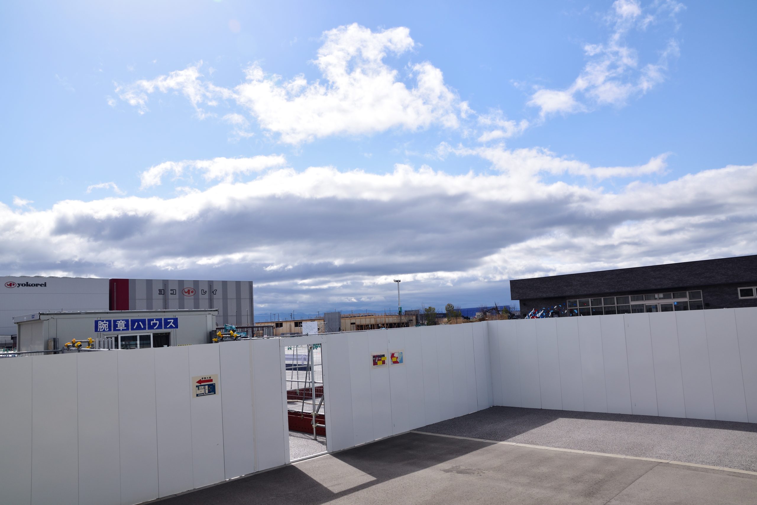 ゲート前に広がっていた待機場、万博期間中は入場待ちの長い列が続いてましたが、今は作業員さんようの飯場が並ぶ光景に変わっていました。