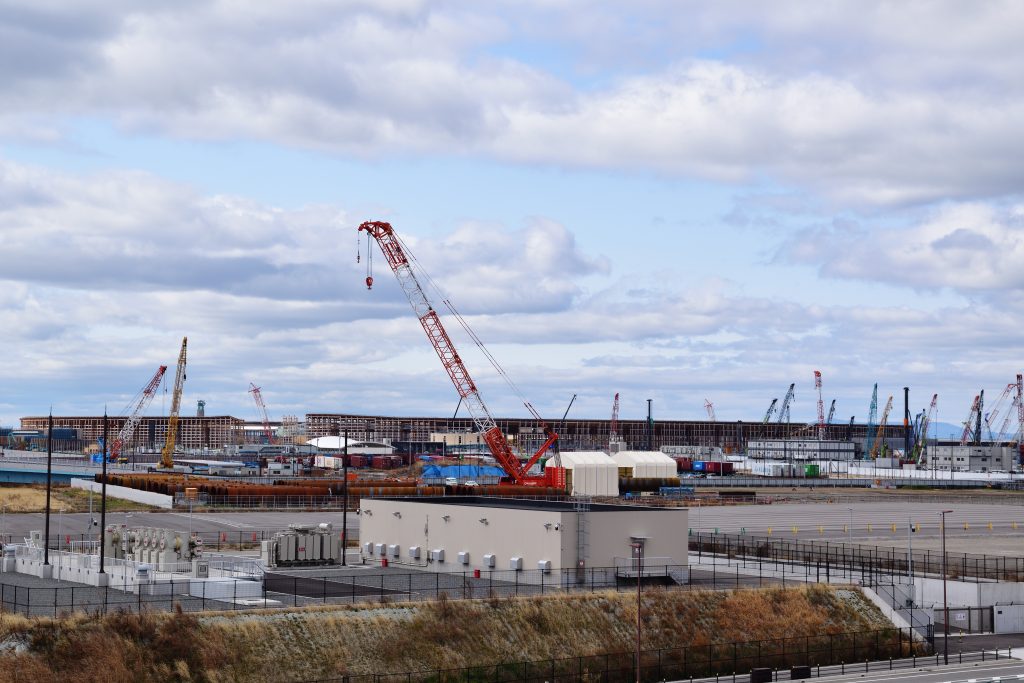 すぐ隣で動き回るクレーンは、全てカジノを含む統合型リゾートの建設工事に使われる重機。