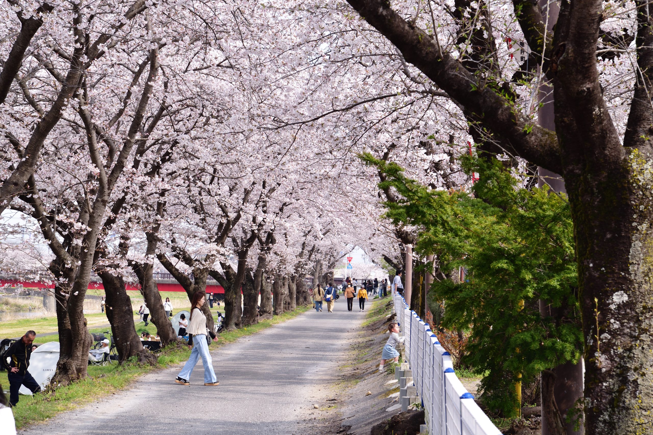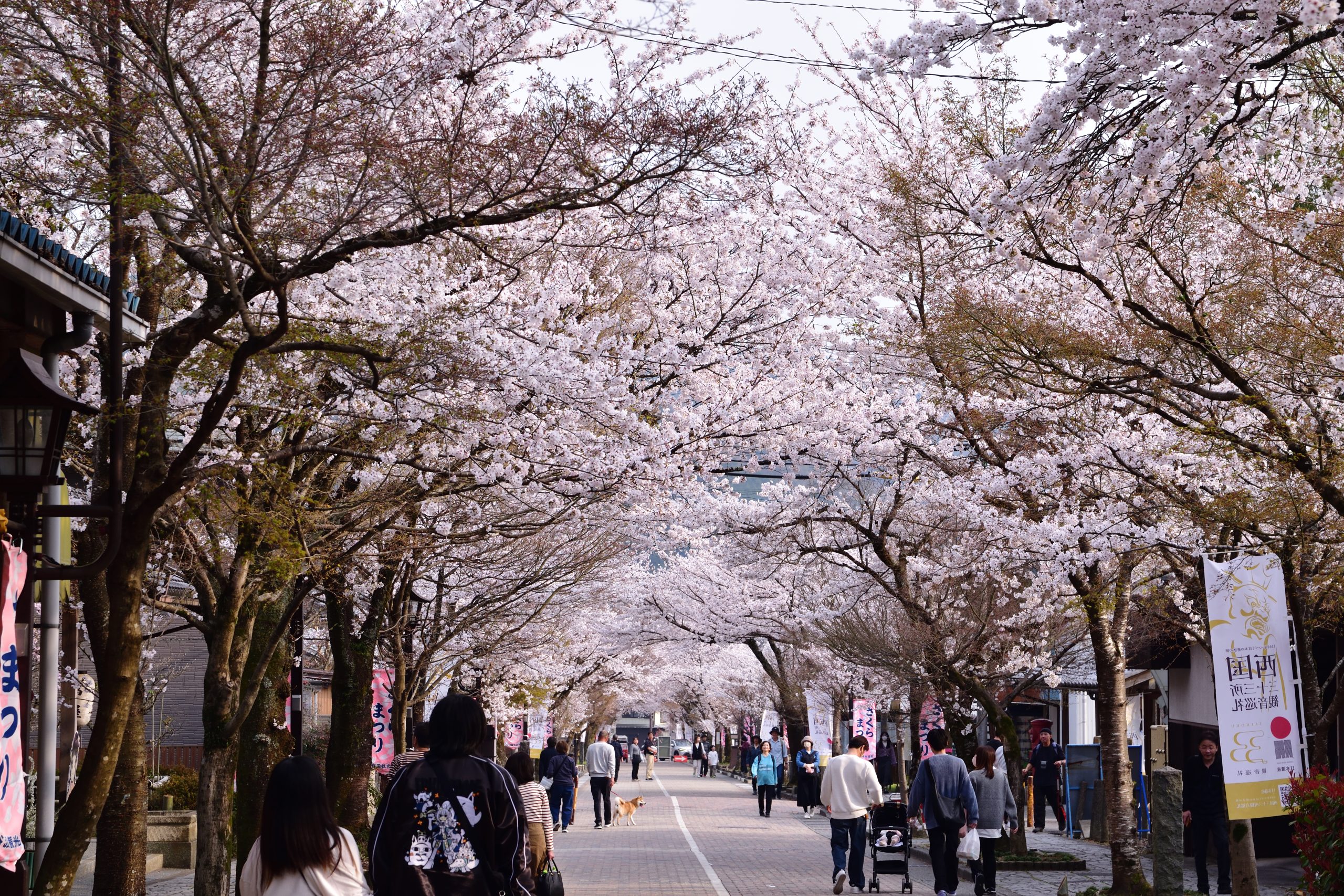桜並木は入り口から800メートルほど。こちらは先程とは変わって、お参りがてらといった感じでしょうか。みんな桜並木の下をゆったり歩きながら、満開の桜を楽しんでおられました。